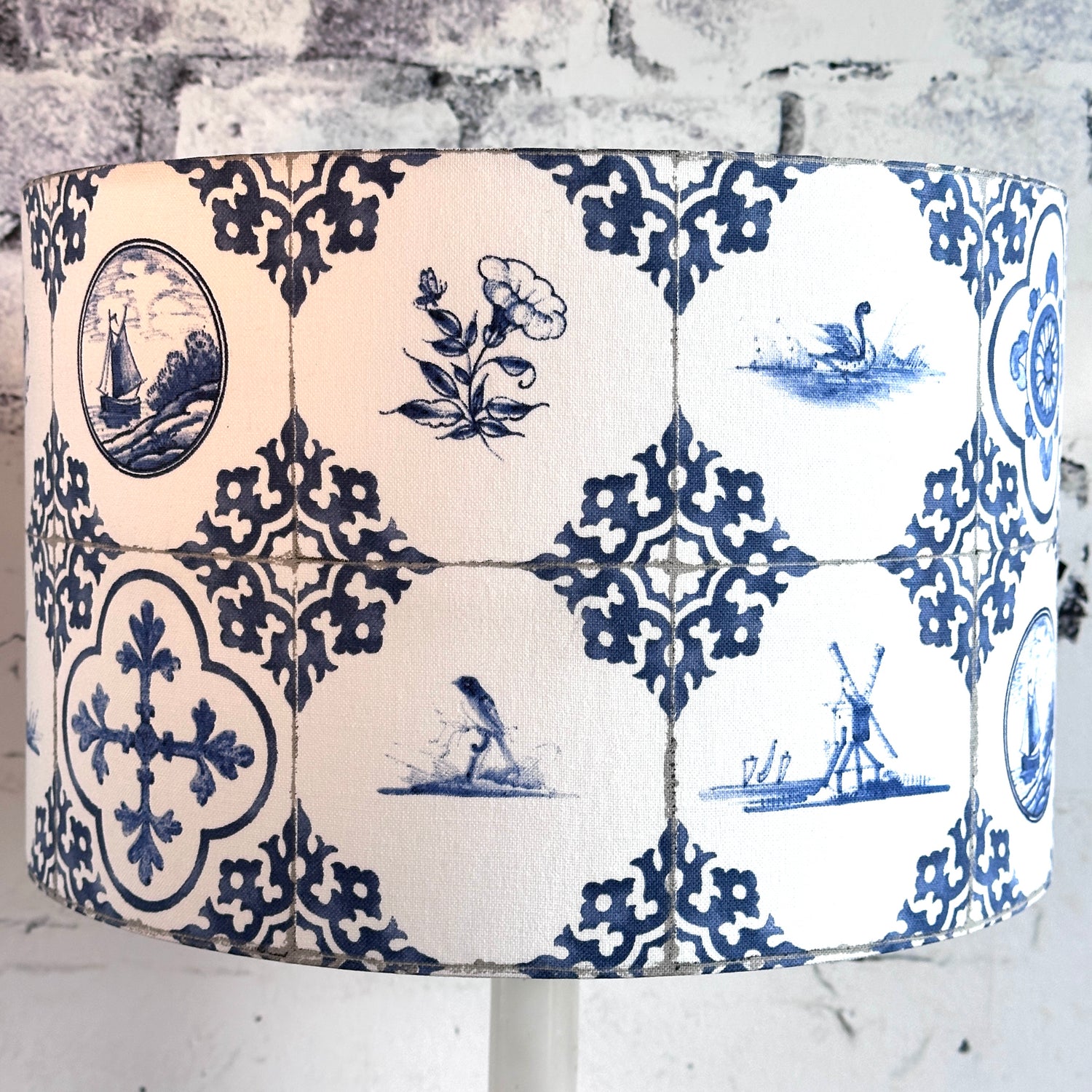 Breng een vleugje klassieke Nederlandse charme in je interieur met deze prachtige handgemaakte lampenkap. Deze unieke lampenkap is bekleed met een stof die is versierd met elegante Delfts blauwe tegeltjes op een frisse, witte achtergrond. De traditionele blauwe patronen geven een tijdloze en stijlvolle uitstraling aan elke ruimte.