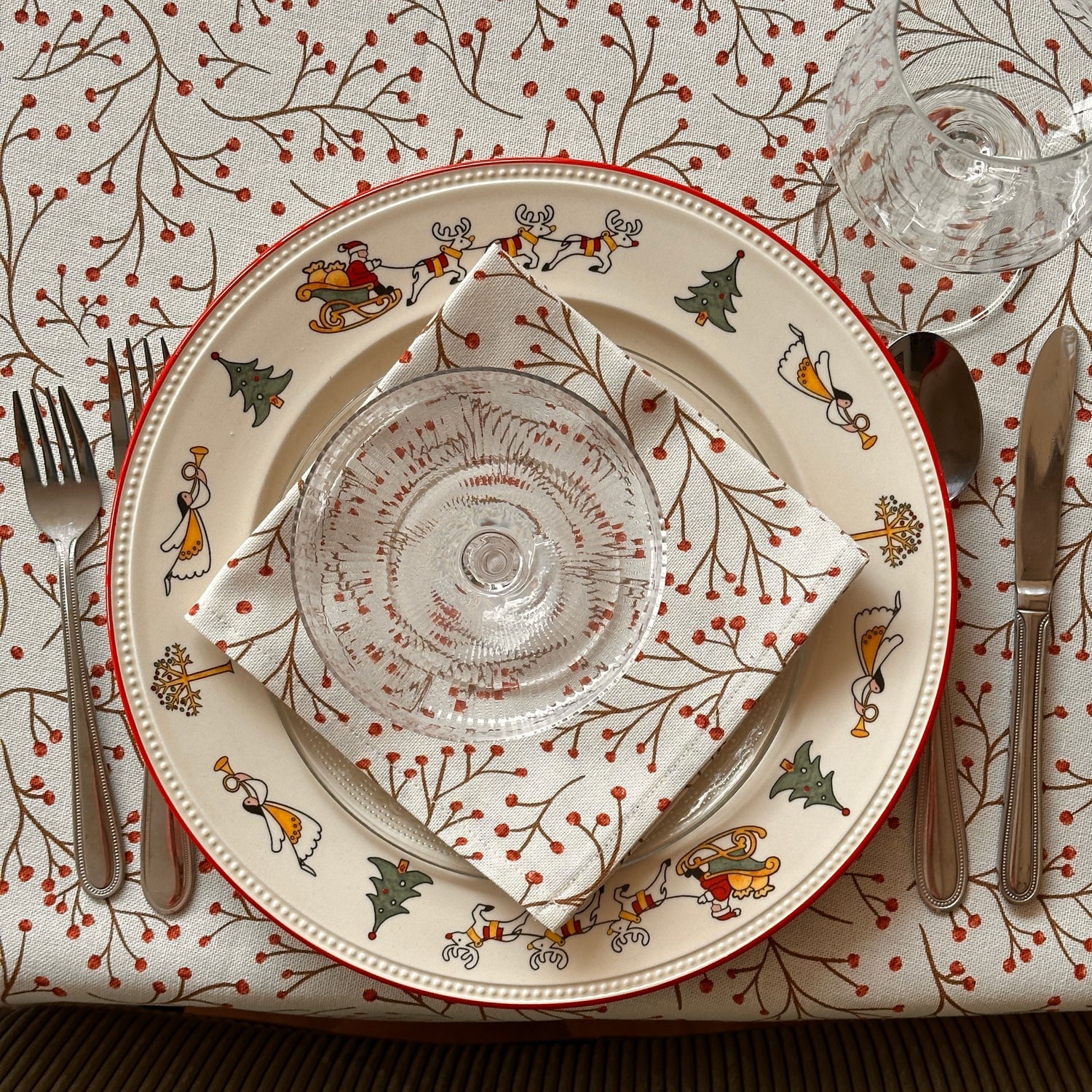 Deze servetten met takjes- en bessen print geven je mooi gedekte tafel een rustige en elegante uitstraling. Het natuurlijke dessin in warme tinten maakt het tafelkleed en de servetten veelzijdig en geschikt voor ieder seizoen.